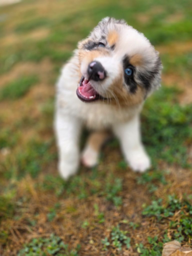 Petit mâle bleu merle avec ses petits bandeaux aux yeux saura vous remplir d'amour. Il est très demandeur de bisous et de caresses. Il passe son temps à jouer avec ses doudous.
